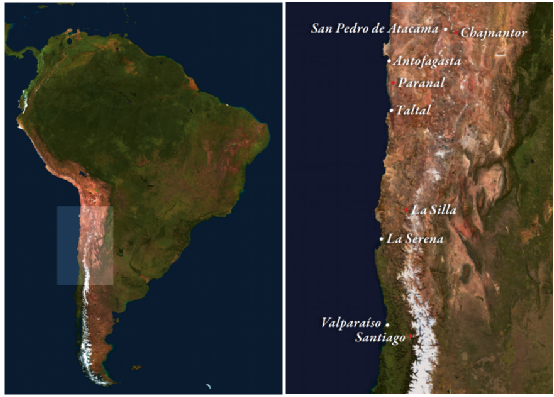 位于南美洲南北向最長的國家——智利。右側是左側白色陰影區(qū)域的放大圖,可以看到La Silla, Paranal,Chajnantor這三個臺站的位置。