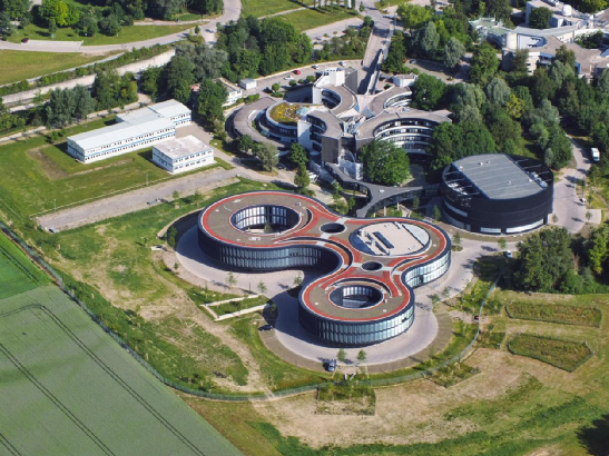 鳥瞰已搬到德國加興(Garching)的歐南臺總部,下方的紅色頂建筑和其上方的灰褐色頂建筑為總部主樓,右側黑色圓形建筑為技術部建筑。左側方形建筑則是集裝箱搭建的臨時建筑,此前的自適應光學部就占據(jù)此小樓。